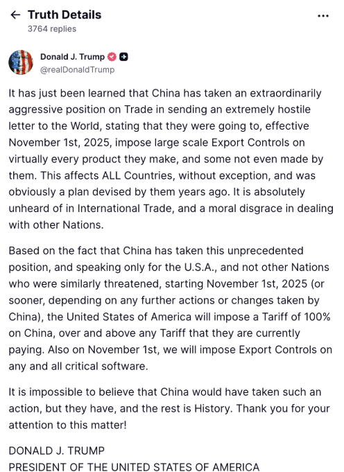 ახალი ამბები! დონალდ ტრამპმა 100%-იანი ტარიფები დააწესა ყველა ჩინურ საქონელზე 1 ნოემბრიდან.